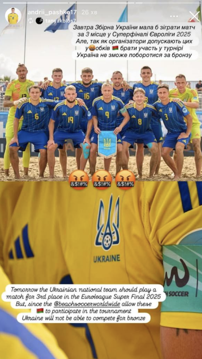 «Должны были сыграть матч за третье место в Суперфинале Евролиги. Но так как организаторы допустили этих уродов (сборную беларуси) к участию в турнире, то сборная Украины не будет играть этот матч», – сказал Пашко.