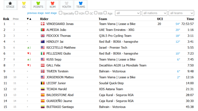 Победителем в генеральной классификации стал Йонас Вингегор. Жоау Алмейда отстал на одну минуту и 16 секунд. Третье место занял Том Пидкок.