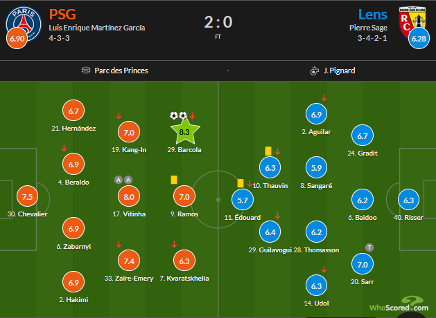 Оценки WhoScored за матч ПСЖ – Ланс (2:0)