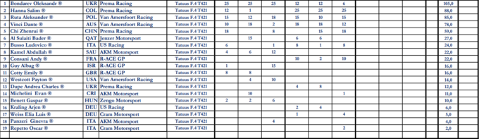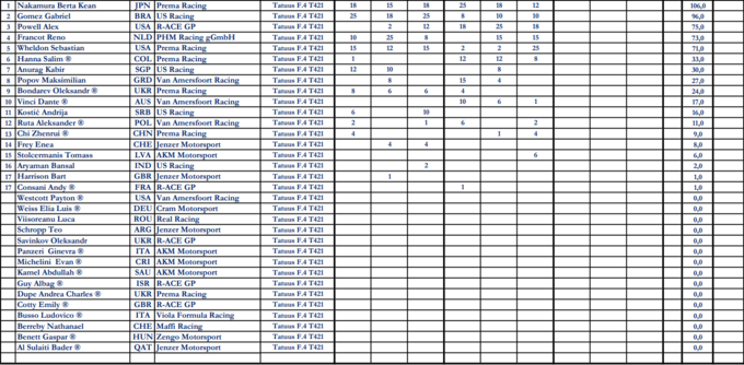 А вот для украинца в этом году титул в общем зачете уже недостижим. Однако среди новичков ситуация интереснее. Там лидирует пилот академии команды Ф1 Williams Racing, и делает это достаточно уверенно, имея преимущество почти в 20 очков над соперниками. Ближайший преследователь – напарник по команде Према, Салим Ханна, у которого на 17 очков меньше. Разрыв не слишком велик, поэтому все будет решаться в трех финальных заездах в Италии.