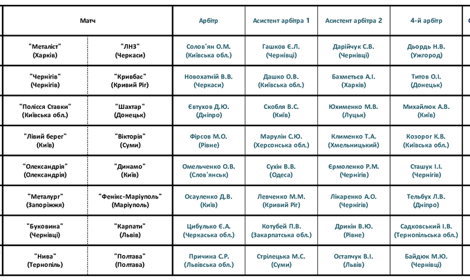 Арбитры: Евтухов Д.Ю. (Днепр), Скобля В.С. (Киев), Юхименко М.В. (Луцк), Михайлюк А.В. (Киев), Ярменчук И.А. (Киев)