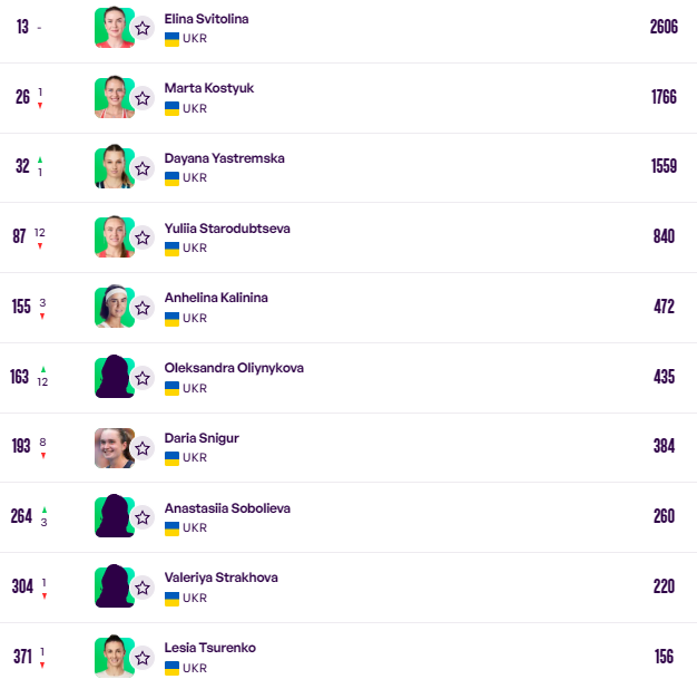 Элина осталась на 13-м месте, Марта опустилась на 26-е, Даяна Ястремская теперь 32-я