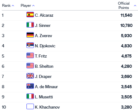 Первой ракеткой является Карлос Алькарас. Вторым идет Янник Синнер. Отрыв Синнера от третьего Александра Зверева составляет 4850 очков. Это столько же, сколько отделяет Зверева от Миомира Кецмановича – серб располагается аж на 47-й позиции.