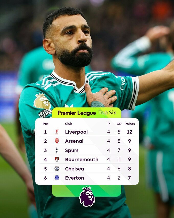 На вершине турнирной таблицы находятся: Ливерпуль (12), Арсенал, Тоттенхэм, Борнмут (по 9), Челси (8).