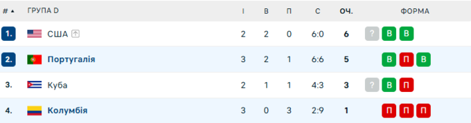 Таким образом, европейцы с двумя победами остаются фаворитами на выход в 1/8 финала. Вытеснить их может только Куба, которая сегодня в 12:30 по киевскому времени сыграет с США. Чтобы опередить Португалию, команде из Северной Америки необходимо побеждать с любым счетом.