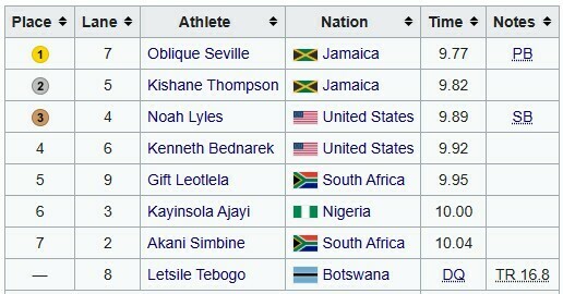 Сенсационным чемпионом мира стал 23-летний ямаец Облик Севиль, который показал лучший результат в карьере – 9.77 сек. Серебро завоевал его соотечественник Кишейн Томпсон (9.82), а бронзу получил американец Ноа Лайлс (9.89).