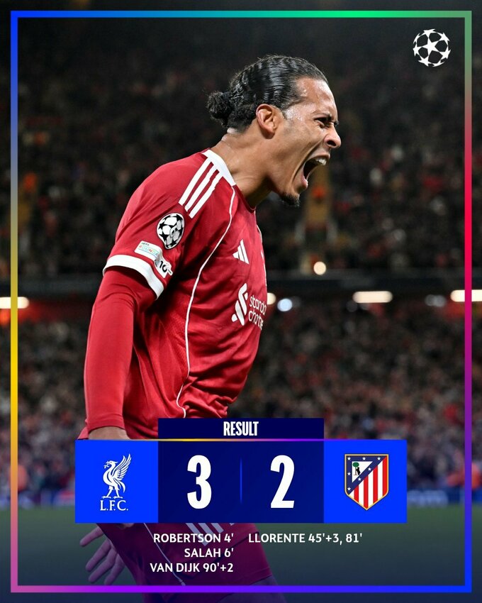 На 90+2 минуте Вирджил ван Дейк принес победу Ливерпулю над Атлетико (3:2).