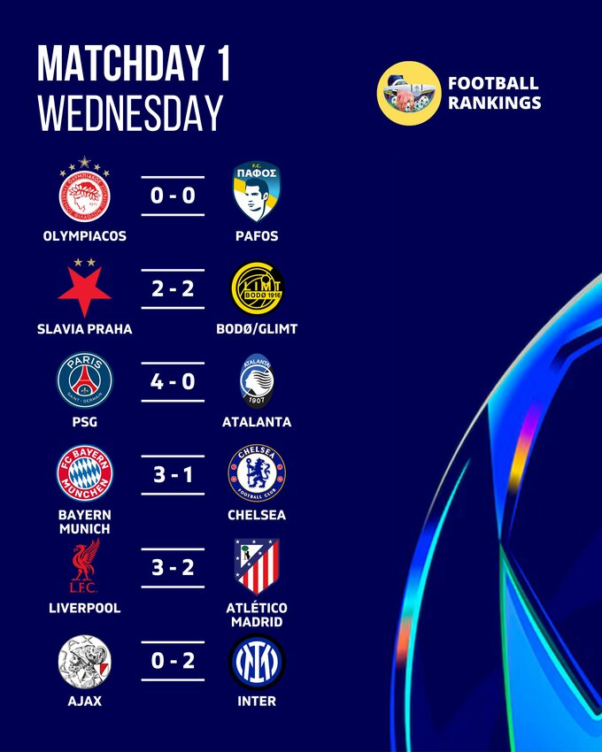 Вечером 17 сентября прошли матчи 1-го тура Лиги чемпионов УЕФА 2025/26.