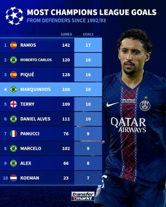 Капитан и защитник «ПСЖ» Маркиньос отличился забитым мячом в последнем матче и вышел на четвертое место в списке самых результативных защитников Лиги чемпионов с сезона 1992/93 – 10 голов в 108 поединках.