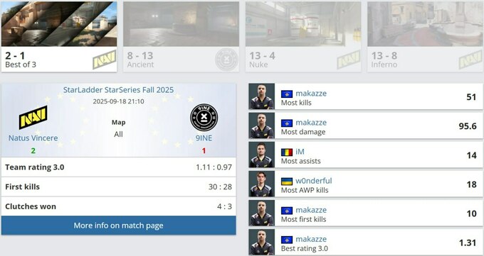 Первый игровой день для NAVI на StarLadder StarSeries Fall 2025 в Будапеште завершился победой против команды 9INE со счетом 2:1.