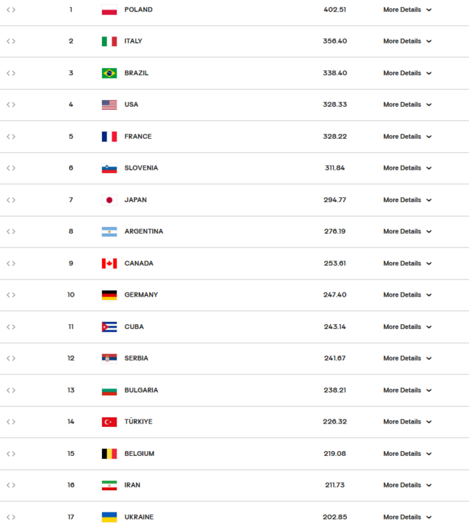 Лидирует в рейтинге Польша – единственная команда, набравшая более 400 очков, а второе и третье места занимают Италия и Бразилия соответственно. Этап плей-офф чемпионата мира стартует 20 сентября.