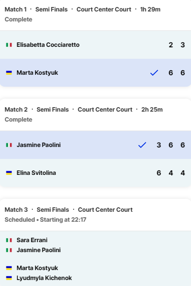 По итогам двух одиночных матчей счет 1:1. Марта Костюк обыграла Элизабетту Коччаретто, а Элина Свитолина уступила Жасмин Паолини.