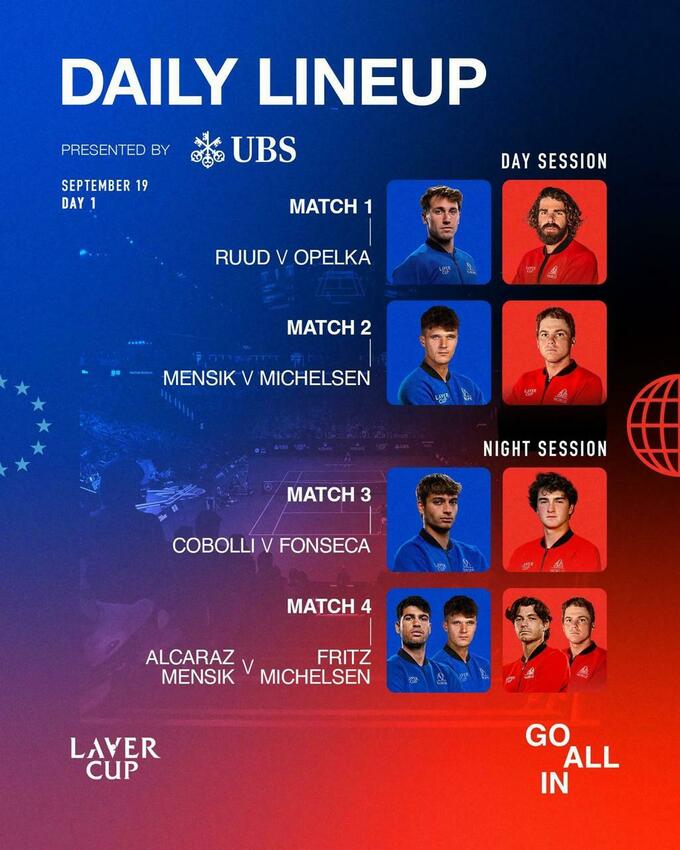 - Карлос Алькарас / Якуб Меншик (Европа) – Тейлор Фритц / Алекс Микельсен (Мир)