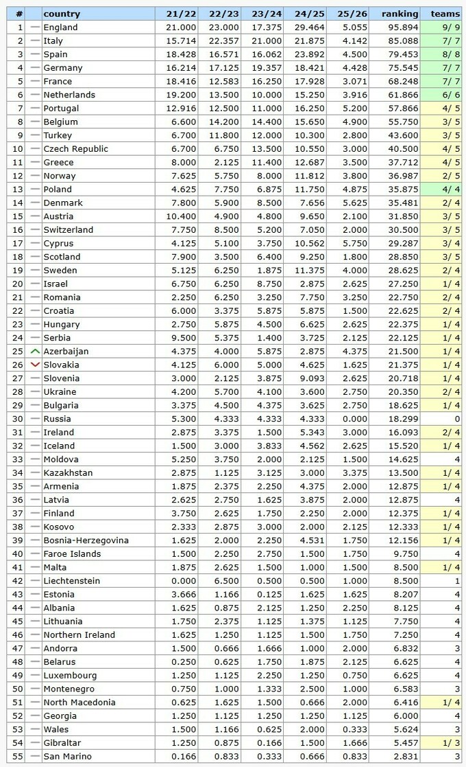 Таблица коэффициентов УЕФА 2026
