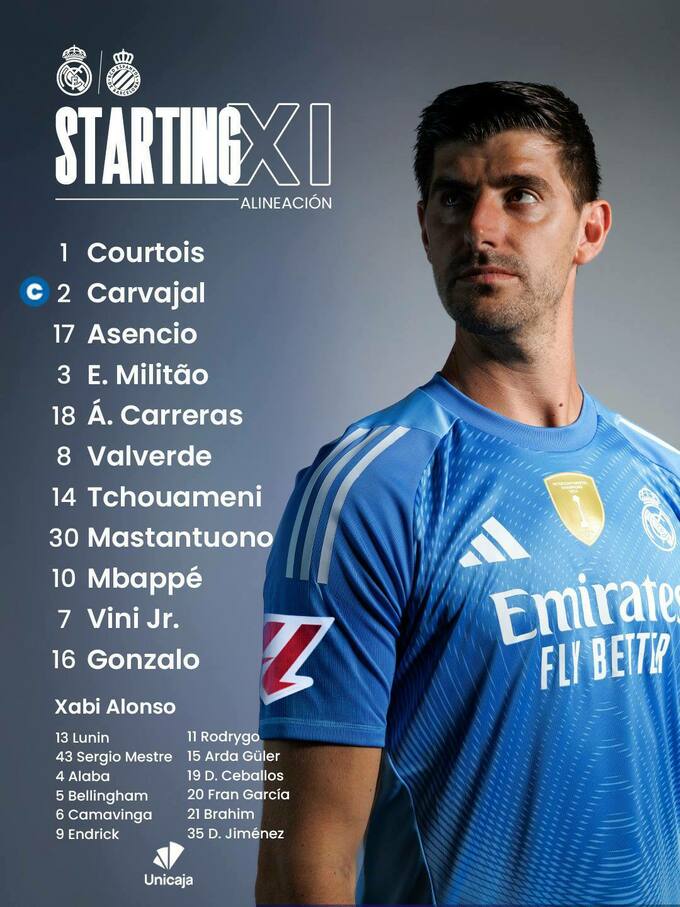 Наставник королевского клуба Хаби Алонсо ожидаемо оставил украинского голкипера Андрея Лунин в резерве. Ворота сливочных будет защищать Тибо Куртуа.