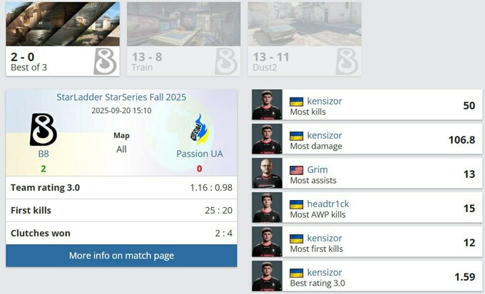 Первая карта (Train) стала легкой прогулкой для B8 – команда без проблем закрыла соперника со счетом 13:8. Зато на Dust2 борьба была куда напряженнее: Passion UA оказали серьезное сопротивление, но «восьмерки» все же дожали игру – 13:11.