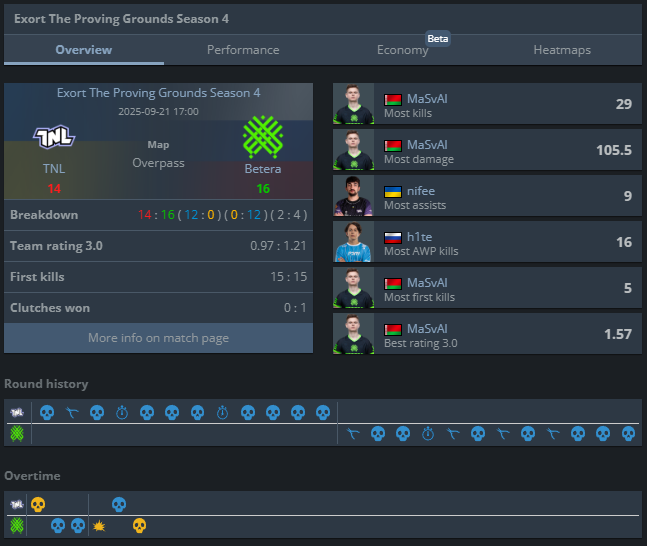 На турнире Exort The Proving Grounds Season 4 произошла настоящая сенсация. Украинский клуб TNL, выиграв 12 стартовых раундов на карте Overpass, не сумел довести дело до победы и уступил белорусской команде Betera со счетом 14:16.