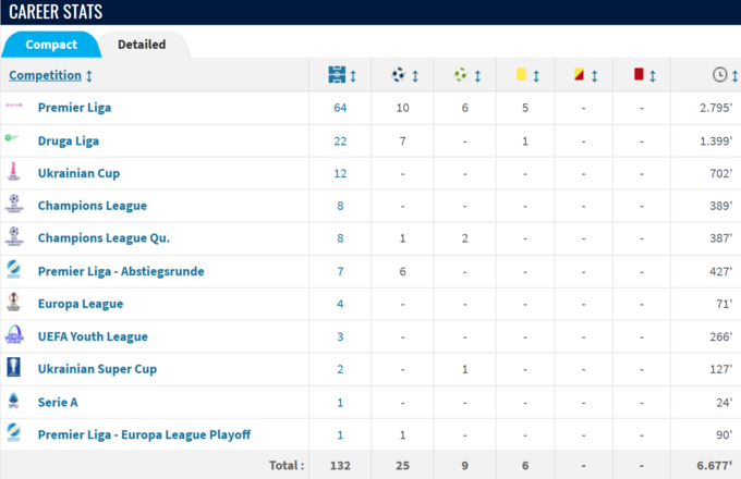 Всего на клубном уровне украинский нападающий провел 132 матча, забил 25 голов и отдал 9 результативных передач.