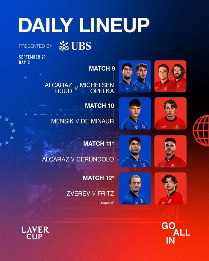 - 22:00. Карлос Алькарас / Каспер Рууд (Европа) – Алекс Микельсен / Рейлли Опелка (Мир)