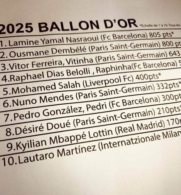 Якобы Дембеле в опросе всего на 5 пунктов сумел обойти 18-летний вундеркинд «Барселоны» и сборной Испании Ламин Ямаль, который набрал 805 очков, в то время как Дембеле ограничился 800.