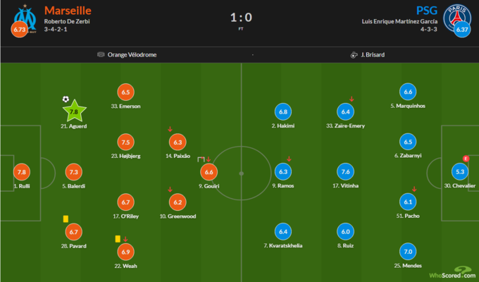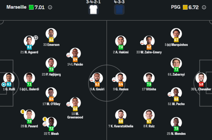Лучшим игроком матча по версии SofaScore стал аргентинский голкипер хозяев Херонимо Рулли. На его счету 5 сейвов и оценка 8.3 баллов. WhoScred выделил марокканского защитника «Марселя» Найефа Агерда, который забил победный гол своей команды и получил оценку 7.8.