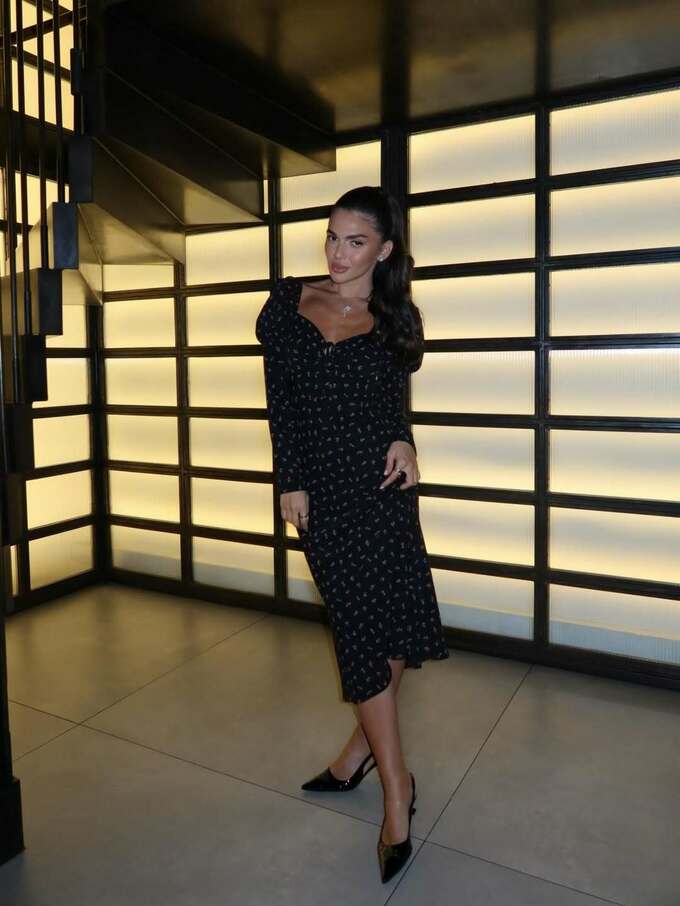 Девушка предстала в длинном темном платье с цветочным принтом, подчеркивающим ее фигуру.