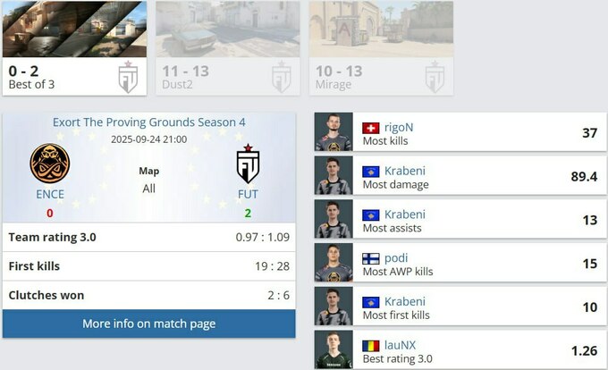Турецкий клуб FUT Esports стал чемпионом Exort The Proving Grounds Season 4, обыграв ENCE в гранд-финале со счетом 2:0 (Dust2 13:11, Mirage 13:10).