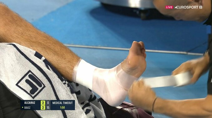 В пятом гейме первой партии Алькарас получил повреждение голеностопа. Карлос взял медицинский тайм-аут, ему затейповали ногу и он смог продолжить поединок, показав команде, что все хорошо.