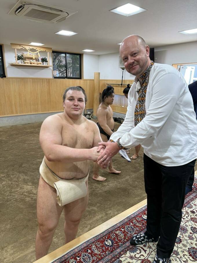 Отметим, что к сентябрьскому турниру Аонишики Арата подходил с новым титулом Комусуби и рекордно быстрым признанием одним из лучших борцов высшей лиги сумо – Саньяку. С этими успехами Даниила поздравил временный поверенный в делах Украины в Японии Александр Семенюк (на фото). Комусуби – четвертый по рангу титул в сумо после Йокодзуны, Озеки и Секиваке.