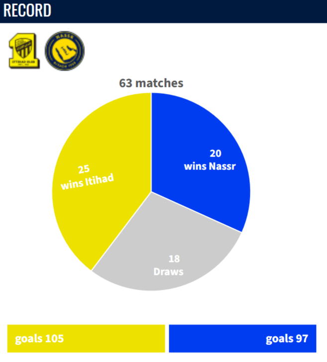 За всю историю противостояний этих команд в чемпионате было проведено 63 матча. «Аль-Иттихад» одержал на пять побед больше, чем «Аль-Наср» (25 против 20). Остальные 18 поединков завершились ничьими.