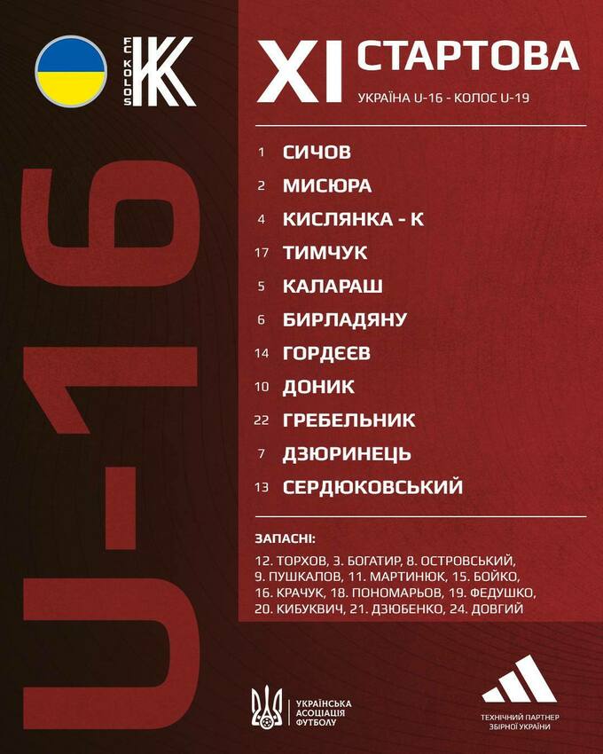 Стартовый состав сборной Украины U-16 на матч против Колоса U-19: