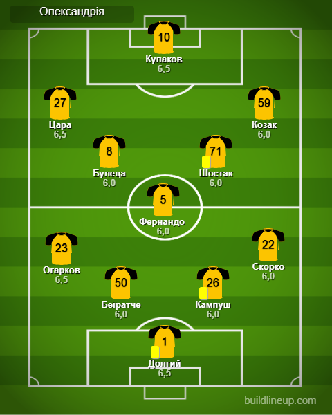 «Александрия»: Долгий – Огарков, Беиратче, Кампуш, Скорко – Фернандо Энрике – Цара (Туати, 87), Булеца (Боль, 87), Шостак (Мишнёв, 59), Козак (Жота, 70) – Кулаков (Кастильо, 70)