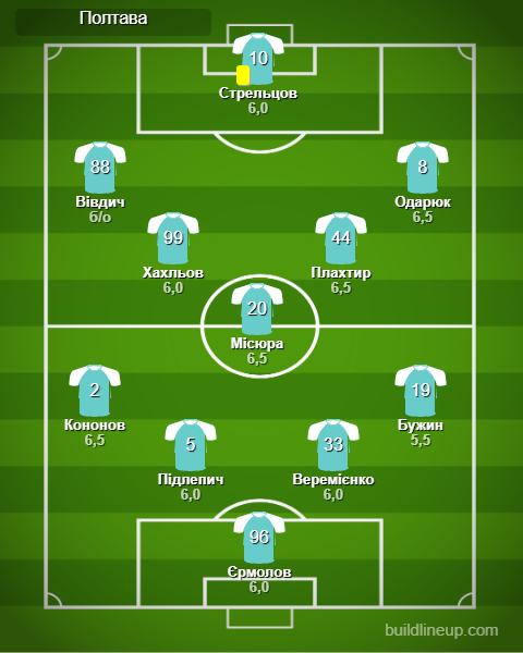 «Полтава»: Ермолов – Кононов, Пидлепич, Веремиенко, Бужин – Мисюра (Онищенко, 85) – Вивдич (Галенков, 8), Хахлёв, Плахтырь, Одарюк – Стрельцов