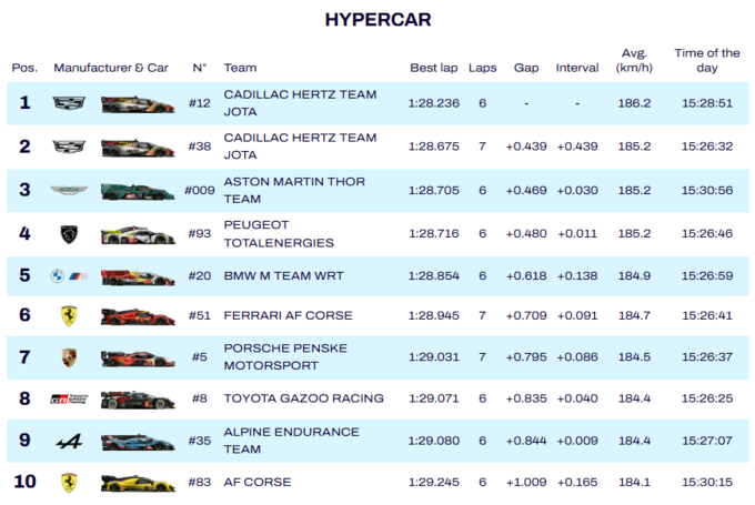Топ-10: Кадиллак №12, Кадиллак №38, Астон Мартин №009, Пежо №93, БМВ №20, Феррари №51, Порше №5, Тойота №8, Альпин №35, АФ Корса (Феррари) №83.