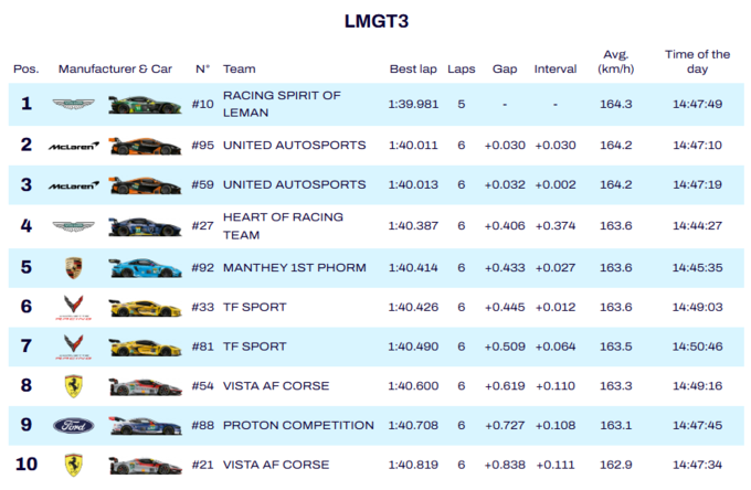 Эдуардо Баррикелло завоевал вторую поул-позицию сезона в ЛМГТ3 за рулем Астон Мартин. Бразилец показал самое быстрое время 1:39.981, опередив Шона Гелаэля на Макларене на 0,03 секунды. Второй Макларен Себастьяна Бода отстал лишь на 0,002 секунды.