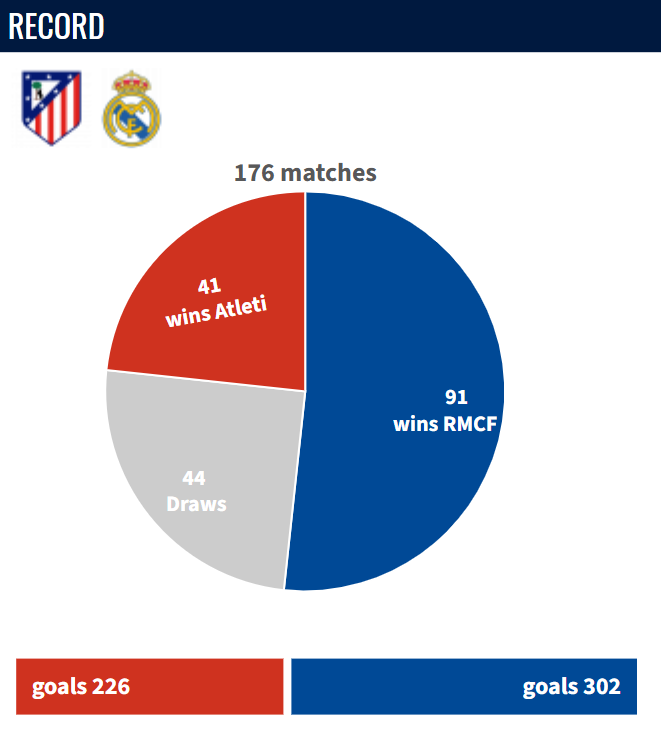 За историю противостояний этих команд в Ла Лиге «Реал» одержал в два раза больше побед, чем «Атлетико» (91 против 41). Еще 44 поединка завершились ничьими. Разница голов в предыдущих 176 матчах составила 302–226 в пользу королевского клуба.