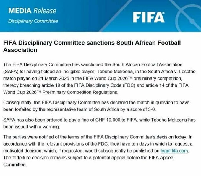 Сборная ЮАР имеет прозвище Бафана-Бафана. Стороны были уведомлены о решении. Они имеют 10 дней, чтобы подать мотивированную апелляцию. Решение о техническом поражении может быть оспорено в Апелляционном комитете ФИФА.