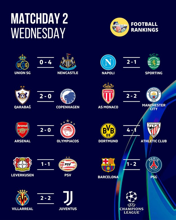 В турнирной таблице, набрав 6 очков из 6, после 2-го тура лидируют: Бавария, Реал, ПСЖ, Интер, Арсенал и сенсационный Карабах.