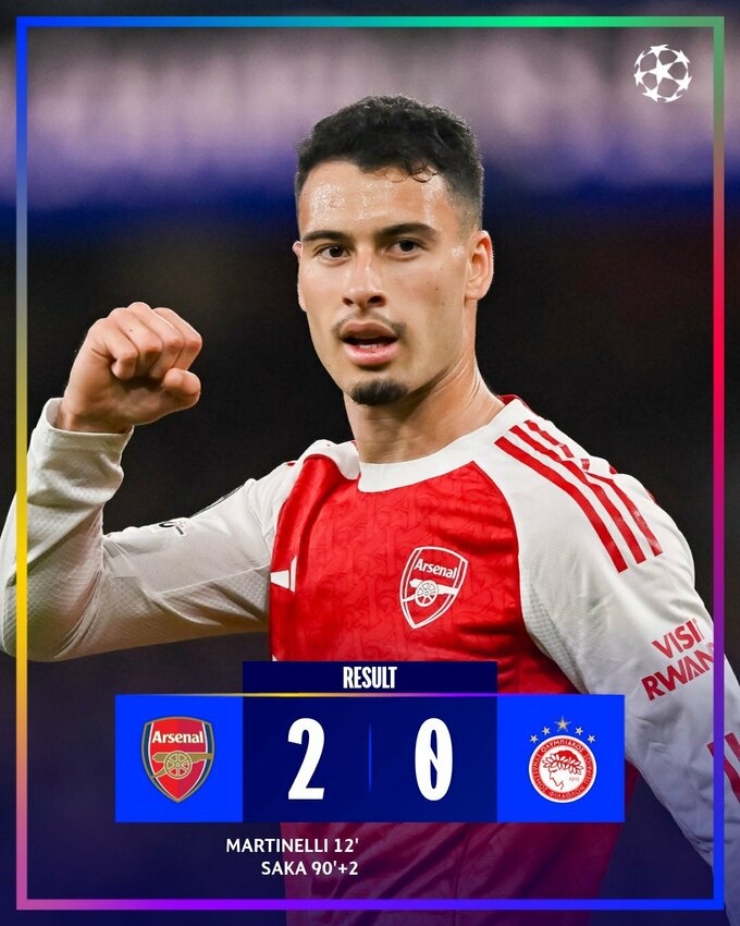 | 5 | Арсенал | 2 | 2 | 0 | 0 | 4 - 0 | 21.10.25 22:00 Арсенал - Атлетико Мадрид01.10.25 Арсенал 2:0 Олимпиакос Пирей16.09.25 Атлетик Бильбао 0:2 Арсенал | 6 | |