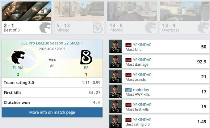 Команды обменялись победами на своих пиках: Mirage остался за B8, а Inferno – за FURIA. Судьба матча решалась на Overpass, где настоящим героем стал латвиец Марекc «YEKINDAR» Галинскис.