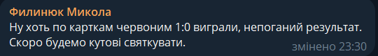 Филинюк Микола: Ну хоть по карточкам красным 1:0 выиграли, неплохой результат. Скоро будем угловые праздновать.