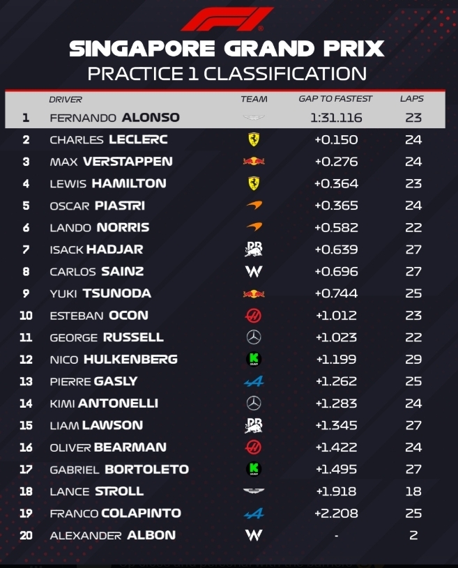 В первой тренировке лучшим неожиданно стал гонщик Астон Мартина Фернандо Алонсо, опередивший Шарля Леклера и Макса Ферстаппена. Оскар Пиастри и Ландо Норрис искали правильные настройки машины и закончили в топ-6.