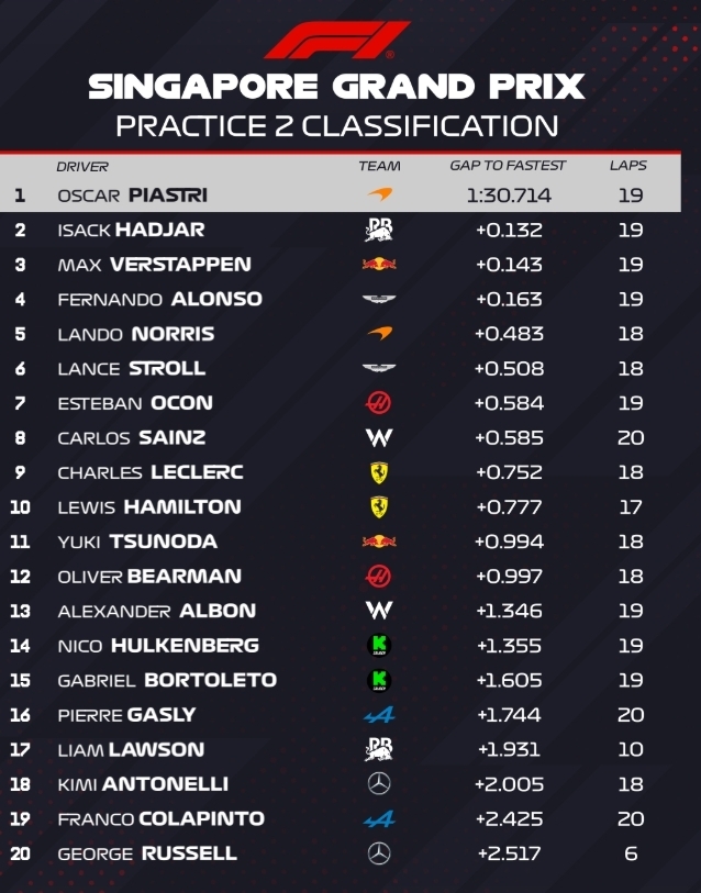 Во второй тренировке лучшее время показав Оскар Пиастри на Макларене, однако из-за аварий и различных инцидентов практика получилась хаотичной – далеко не все пилоты получили возможность спокойно показать время.