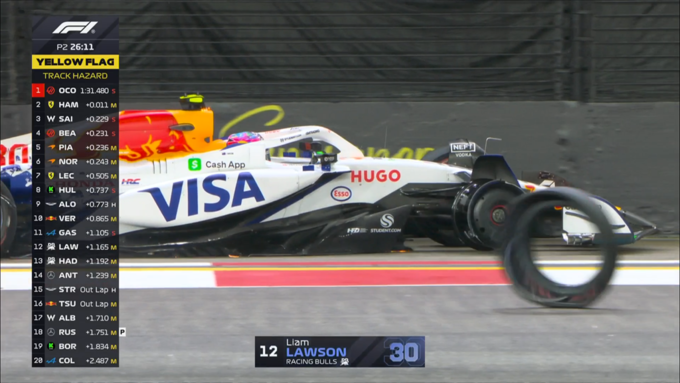 Во время сессии были красные флаги из-за аварий Джорджа Расселла на Мерседесе и Лиама Лоусона на Рейсинг Буллз, а в конце практики на пит-лейн столкнулись Шарль Леклер и Ландо Норрис.