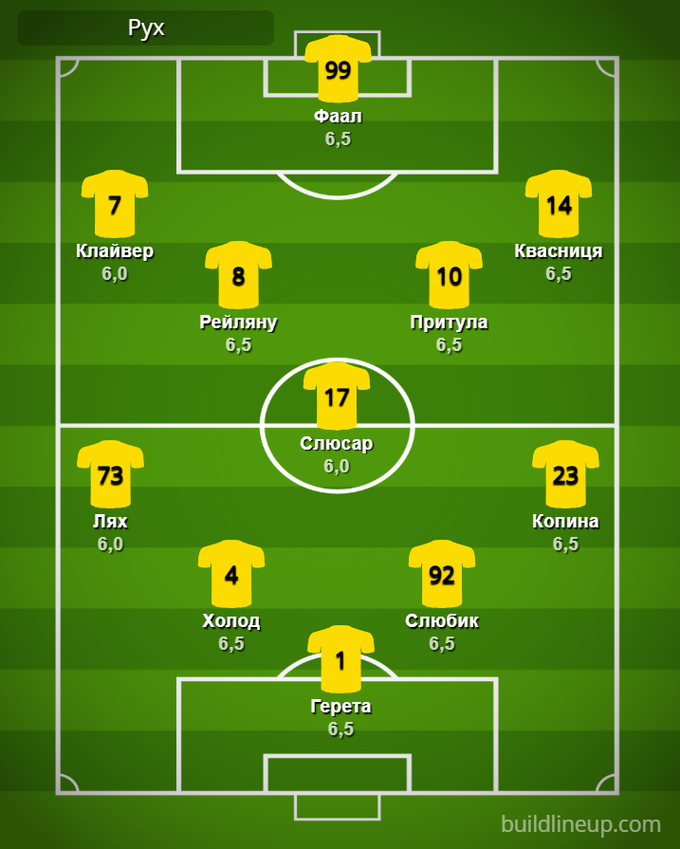 «Рух»: Герета – Лях, Холод, Слюбик, Копина – Рейляну, Слюсар (Подгурский, 59), Притула – Клайвер, Фаал (Алмазбеков, 88), Квасница (Рунич, 78).