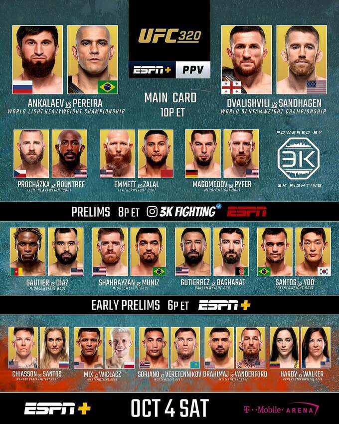В Лас-Вегасе состоится шоу смешанных единоборств UFC 320, главным событием которого станет титульный бой в полутяжелом весе (до 93 кг). Турнир пройдет в ночь на 5 октября на арене «T-Mobile Arena» в США.