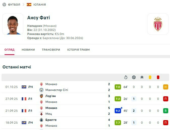 Ансу Фати выступает за Монако на правах аренды из испанской Барселоны. Ему удалось перезагрузить свою карьеру и добиться отличных результатов в сентябре.