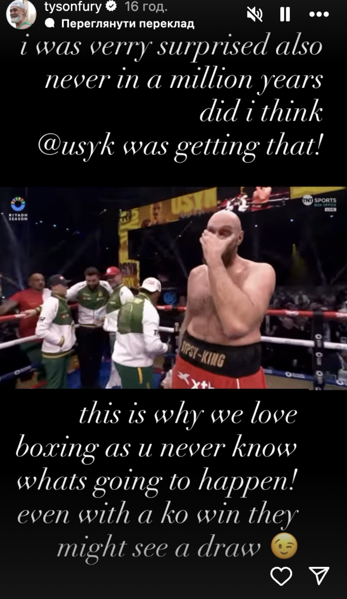 «Я был действительно удивлен, никогда бы не поверил, что Усик выиграет этот поединок. В этом и особенность бокса – случается что угодно. Даже когда нокаутируешь соперника, судьи могут дать ничью», – отметил Фьюри.