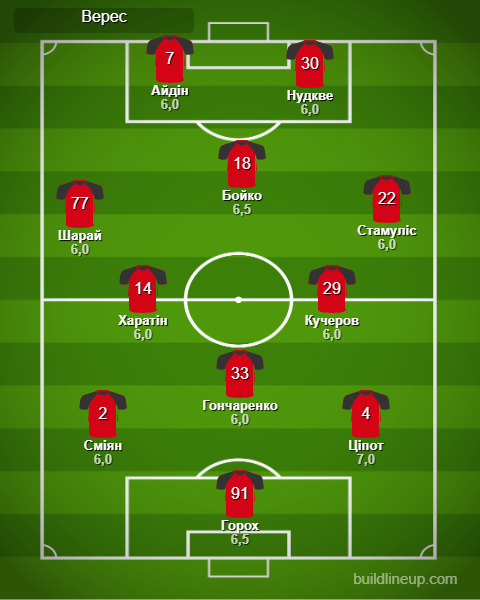 «Верес»: Горох – Смиян (Корнийчук, 46), Гончаренко, Ципот – Шарай (Протасевич, 83), Харатин (Стень, 69), Кучеров, Стамулис – Бойко – Айдин (Нонго, 69), Ндукве (Куция, 37)