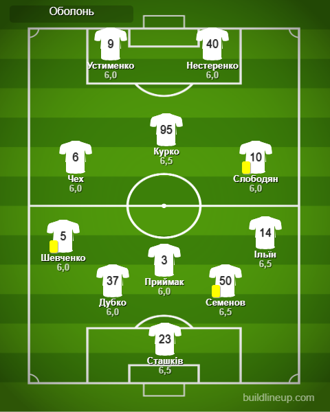 «Оболонь»: Сташкив – Шевченко, Дубко, Приймак, Семенов, Ильин – Чех, Курко (Прокопенко, 73), Слободян (Кулаковский, 45+2) – Устименко (Бычек, 73), Нестеренко (Суханов, 52)